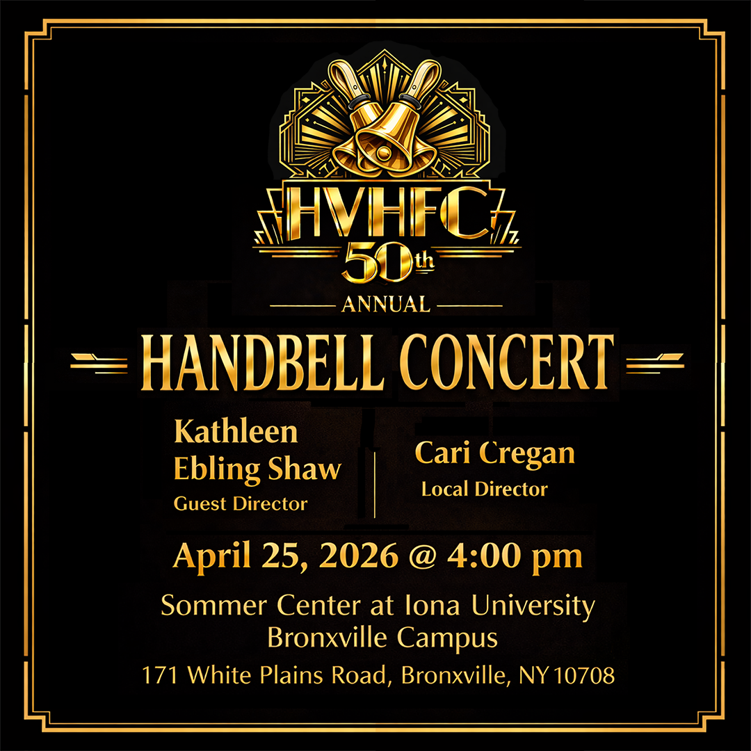 Welcome to Hudson Valley Handbells.org OUR MISSION STATEMENT: The primary mission of the Hudson Valley Handbell. Festival Conference (HVHFC) is to promote the art of handbell ringing by providing an opportunity for local and/or visiting handbell choirs to perform in a massed, divisional, and solo choir framework, and present a concert to the general public. To further the art of handbell ringing, HVHFC may, at the discretion of the governing body, also provide financial assistance to handbell choirs or members of the Handbell Musicians of America who are in serious documented need. Home Contact Us Hudson Valley Young Ringers Festival